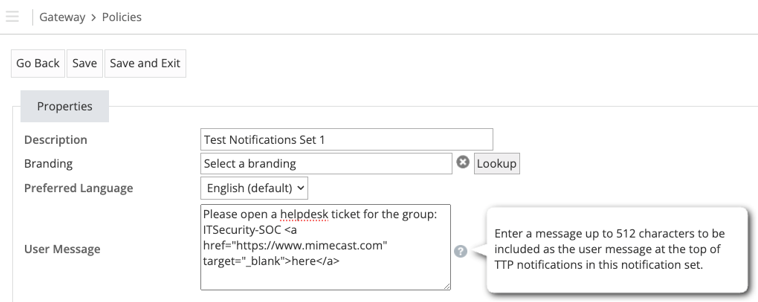 - Once a message is added, it will be added to all of the Targeted Threat Protection notifications in the scope applicable to the relevant Notification Set policy. This functionality also supports hyperlink generation.