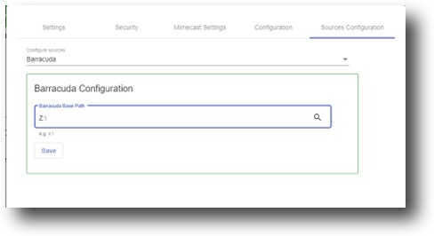 - Select Barracuda from the drop-down and enter the locally attached drive or UNC path to the Barracuda data then click on Save.