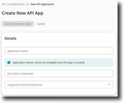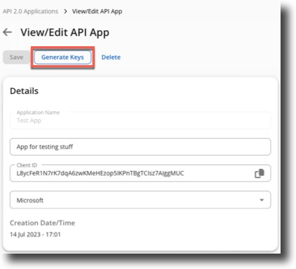 You can generate keys for an existing API 2.0 application, by using the following steps: