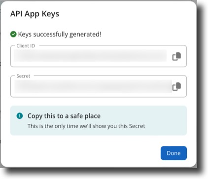 - Copy the Client ID and Secret to a safe location (e.g., a password vault), as they will not be shown again. Losing these credentials means you will need to create a new Application.