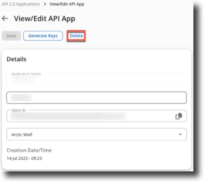 - Click on Delete, to delete the application in the View/Edit API App screen.