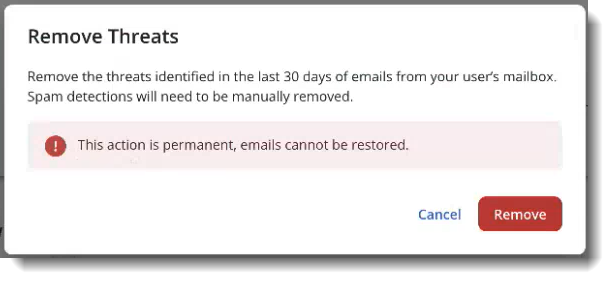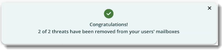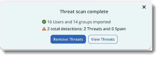 Once your initial Threat Scan has been completed, the results will be displayed in a notification bar, allowing you to either Remove or View Threats. You can also manually do this later by searching the Detections page for threat results. For full details, see the article Message Removal and Release.