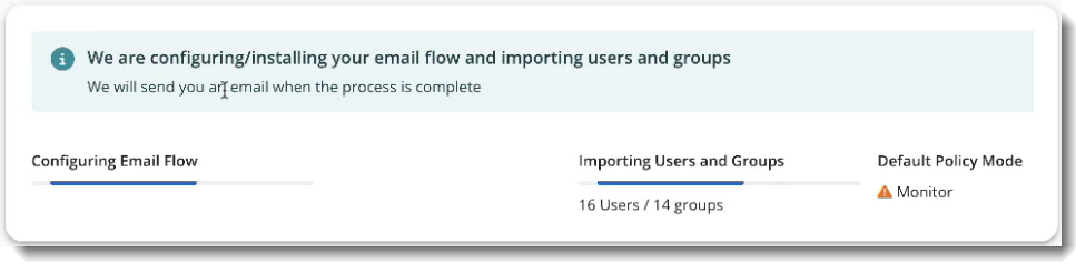 Mimecast Email Security Cloud Integrated will display a notification banner on the home page displaying the progress of configuring your email flow, Importing Users and Groups, and the currently selected Protection Mode.