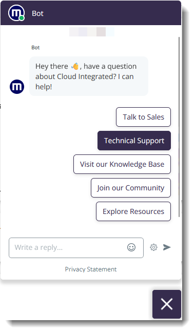 The Chat support bot will appear in the lower right-hand corner of your screen and look like this: