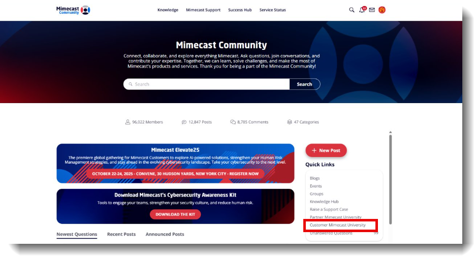- Navigate to Mimecaster Community and click on Customer Mimecast University in the Quick Links menu on the right.