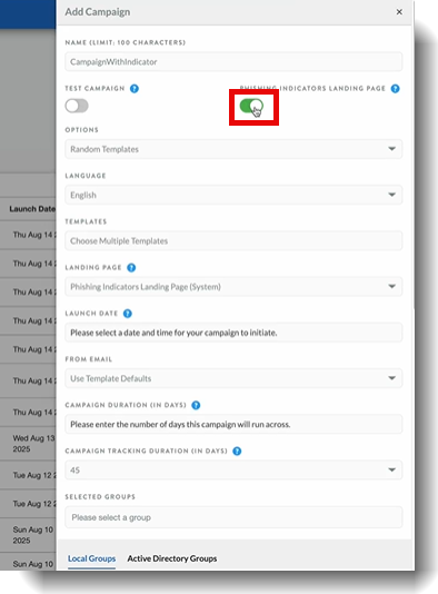 | Phishing Indicators Landing Page | Enable Phishing Indicators Landing Page, when creating a Campaign with indicators. |