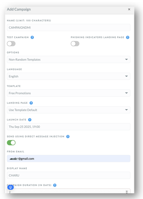 | Campaign Tracking Duration (In Days) | This is an optional field that allows you to determine the duration for which the system tracks user clicks on phishing simulations after the sending period ends. You can select a date range of 5, 10, 15, 30, or 45 days. It defaults to 45 days. |