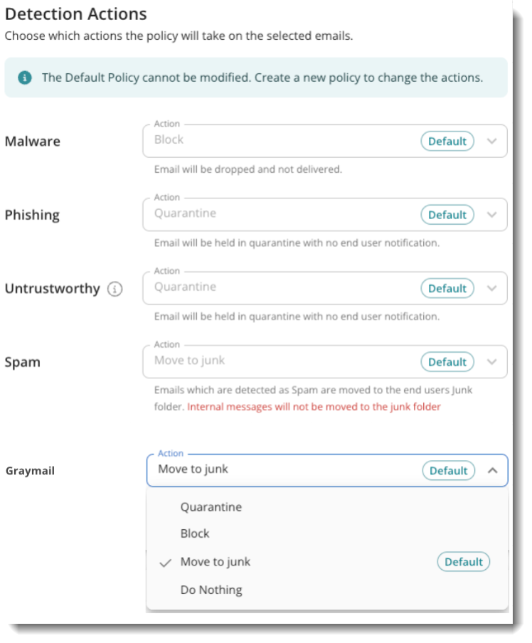 Graymail Filtering allows for greater control over what happens when unwanted/unsolicited emails are received. You can configure the following actions within email policies:
