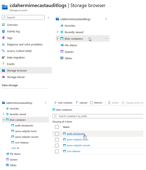 - Select the Container from the left panel, select the Blob Containers, and locate the relevant checkpoints folder (folder names for the different connector types are described in the table at the bottom of this section):