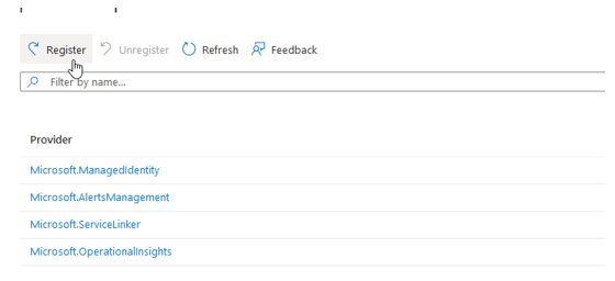 - Search for each of the providers listed above, and ensure the Status is Registered, with a green checkmark. If not, select the provider, and click on Register at the top:
