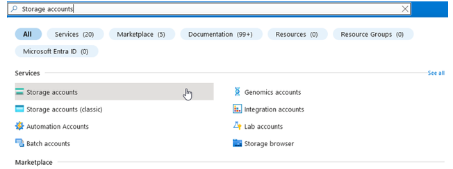 - Search for Storage Accounts and select Storage Account to create a blank checkpoint file for the integration.