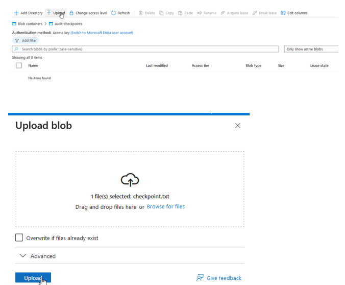 - Create an empty checkpoint.txt file locally and upload it to storage, as shown below. Important please see below that specifies different checkpoint file requirements for other connectors.