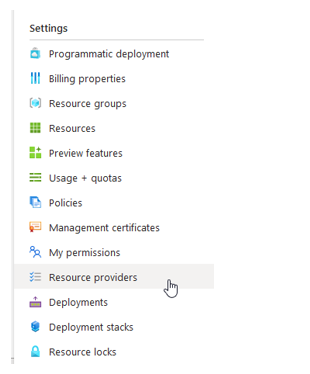 - Click the subscription and find Resource Providers in the left-hand panel under Settings: