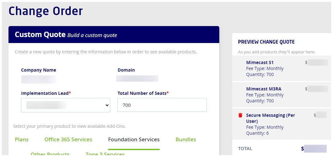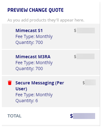 The Preview Change Quote box will reflect your new monthly total after your upsell modifications have been made.