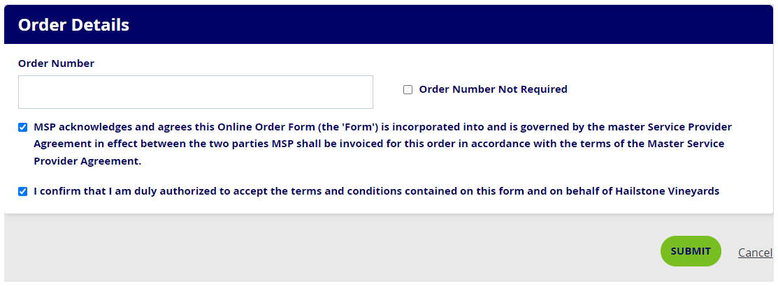 - To proceed, the MSP will select the two checkboxes at the bottom of the screen. This is to show that the Individual or Partner Representative/user acknowledges that the online order form is governed by the master service provider agreement and that the MSP who is placing this order has the authorization to place the order.
