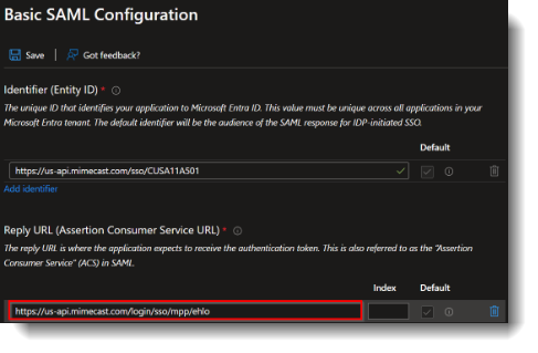 In the Identifier (Entity ID) field, enter the value for your region from the table below. The values entered depend on the Mimecast grid where your organization's Mimecast account is hosted.