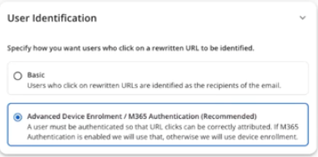 - Advanced Device Enrollment/O365 Authentication (Recommended): The user must be authenticated to attribute URL clicks correctly. If O365 Authentication is enabled, we will use that. Otherwise, we will use Device Enrollment
