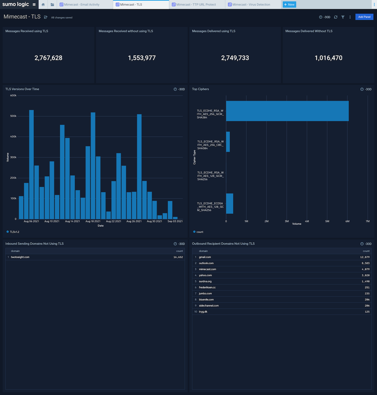 This article contains information on setting up and using the Sumo Logic app for Mimecast to visualize and analyze email event log data, including dashboards for email activity, spam detection, TLS, URL Protection, and virus detection. It is intended for Administrators.