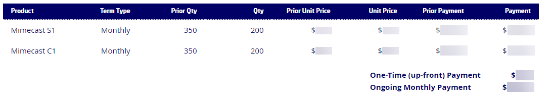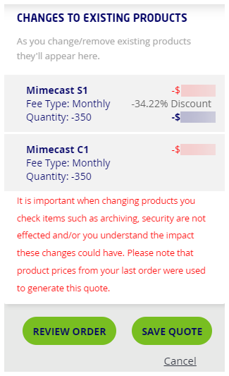Any changes in products or services will be reflected in the Changes to Existing Products box on the right-hand side. In this particular example, we can see the pricing reduction for the new quantity is reflected.