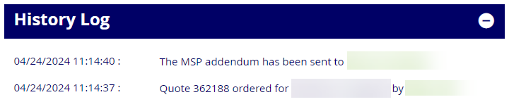 Once you have submitted your order, you will be returned to the Customer Screen. In the History Log section, you will see the change order with date and time of creation.