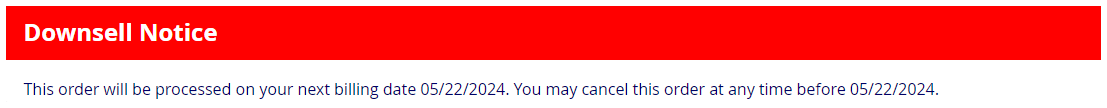 - A Downsell Notice informing you of your next billing date and deadline to cancel the order