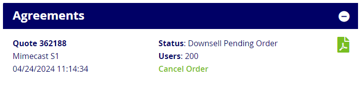 On the Agreements tab, the updated order, which reflects the new quantity of 800 seats, will now be available. In the Agreements section, you will see the change order status of Downsell Pending Order.
