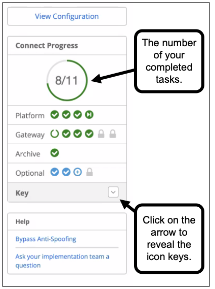 In addition to the Connect Progress panel, a clickable View Configuration link is available on the right- hand side. The Configuration Summary page displays an overview of all the tasks that are completed, pending, or locked. Click on the tabs at the top to view a summary of the tasks in each main menu category: