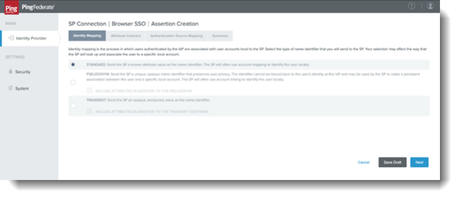 - Browser SSO > Assertion Creation > Identity Mapping: STANDARD: send the AP a known attribute values as the name identifier. The SP will often use account mapping to identify the user locally.