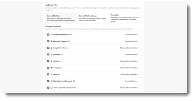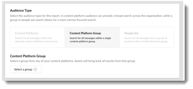 When a user is linked to a Data Access Set that exclusively includes Platform Groups, Aware will permit the user to select only the Audience Type or Platform Group. Refer to the example below: