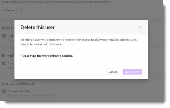 This article contains information on how to Delete a User in Aware, including step-by-step instructions for removing individual users from the system with administrative permissions.