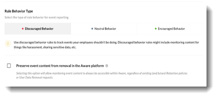 Selecting Advance Options will allow you to save content generated by events within Aware, regardless of Retention policies or User Data Removal requests.