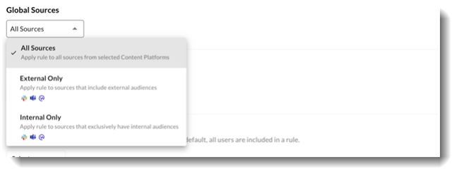 Next to your integrated Content Platform, you can choose what is included by expanding the section. Here, you can select Sources and Groups to include or exclude. This will help to reduce false positives by narrowing the content scope.