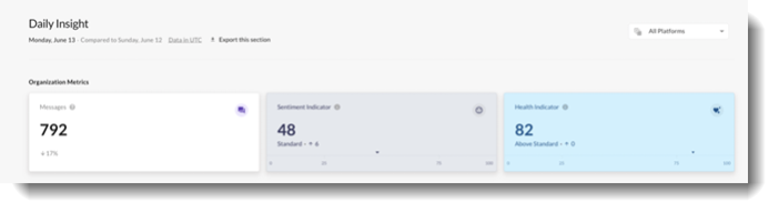 - When paired with the Conversation Sentiment or Health Indicator, the volume of messages can yield great insights about company activity, engagement, feelings, and productivity.