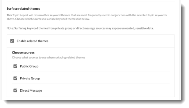 When submitting a new Spotlight Topics Report, a user has the option to surface related themes. When enabled, the processed Topic Report will return relevant themes that are frequently used in conjunction with the defined keywords for the initial search.