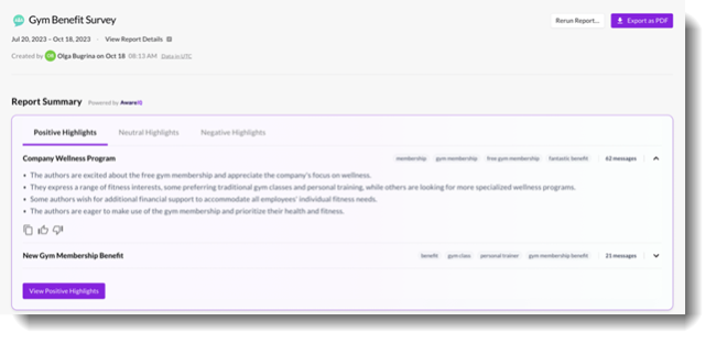 - Aware's Generative AI Summaries can help summarize your survey results, breaking them down into Positive, Neutral, and Negative highlights.