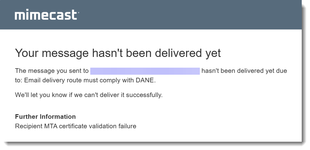 Depending on configuration, an end-user could receive the below notification advising them that a sent message could be delayed due to a DANE policy-related issue.