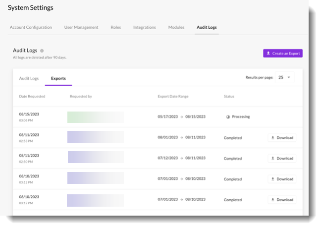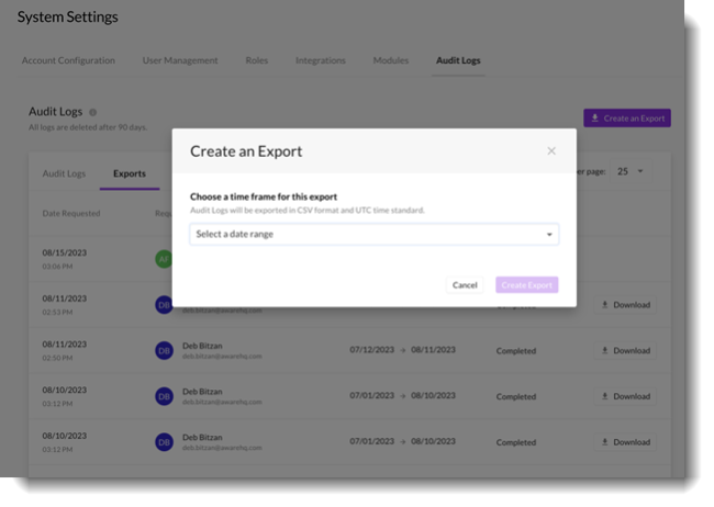 Many users seek more adaptable methods for reviewing Aware audit events. CSV exports facilitate the use of preferred data analysis tools for filtering and analysis. Additionally, this functionality enables users to transfer events to other systems that are unable to utilize the Audit Log API.