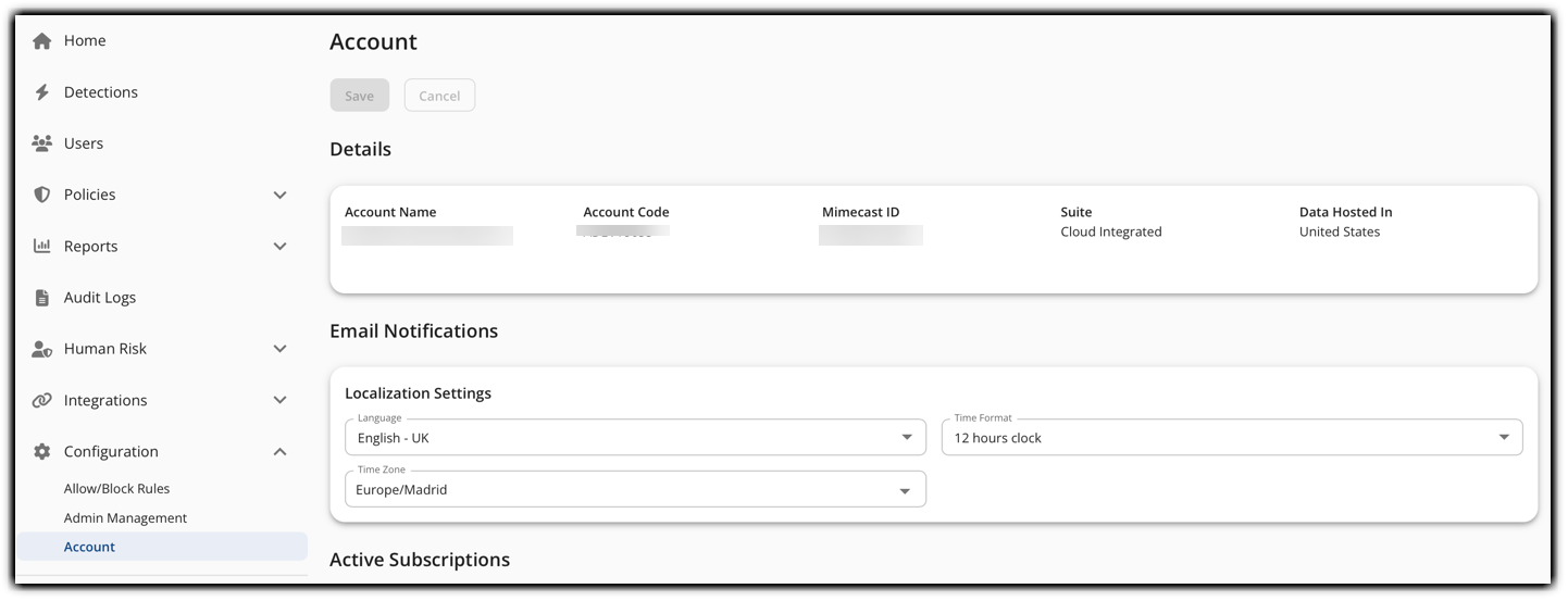 This article contains information on Email Security Cloud Integrated account settings, including account details, localization defaults, active subscriptions, Audit Logs, and the impact of language settings on email notifications and reports.