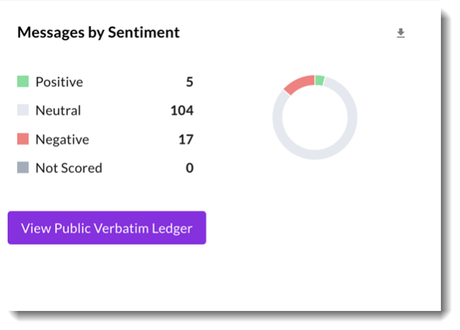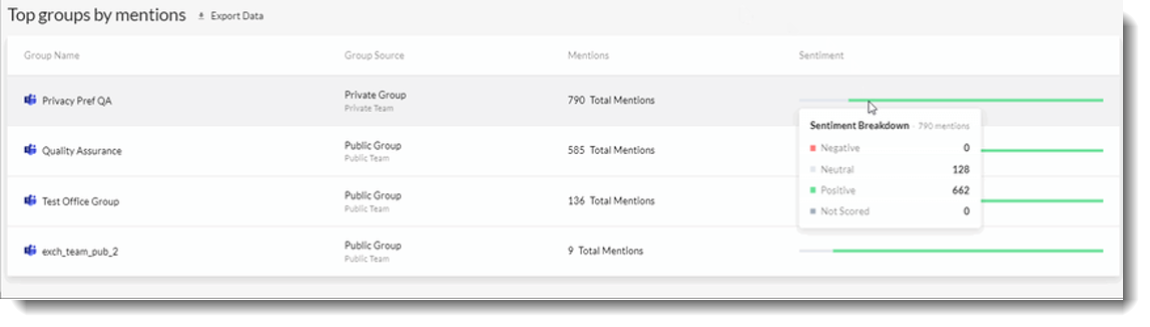 - Top Group by Messages: Top mention count by Group with a Sentiment breakdown. Hover over the Sentiment bar to display the breakdown values. This section is exportable via the download button found in the top right corner of the section.