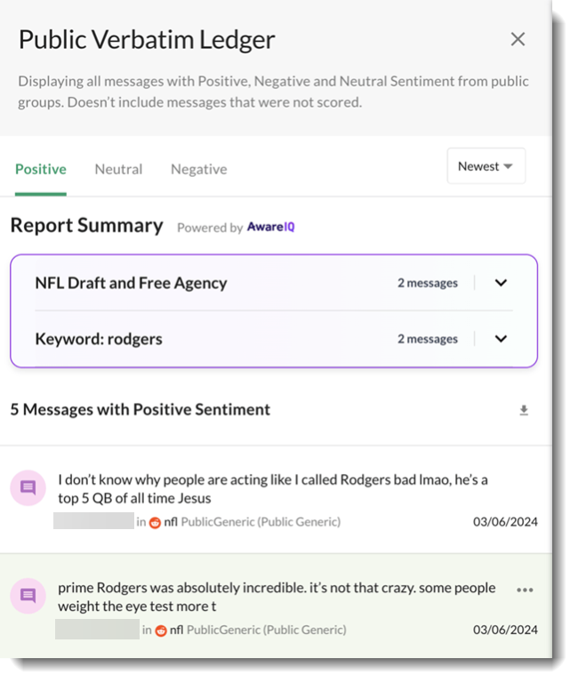 Once the link has been selected, a view will open up displaying the Public content that contributed to the sentiment breakdowns.