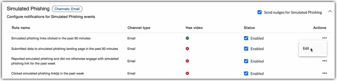 - Navigate to Nudges | Simulated Phishing | Edit.