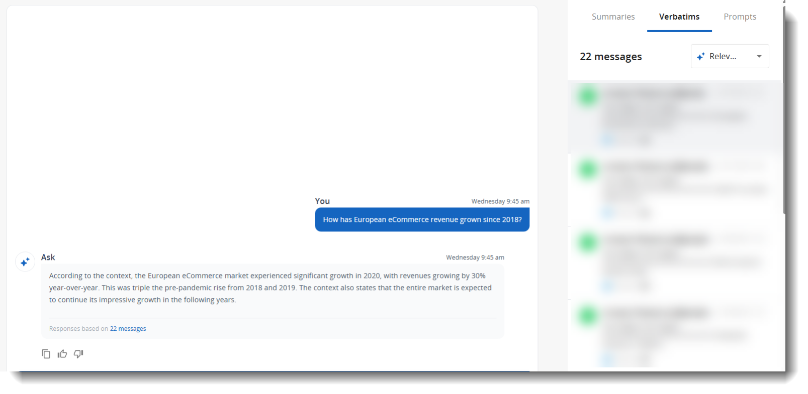 The messages appear on the right-hand side of the screen under Verbatims, Summaries, or Prompts.