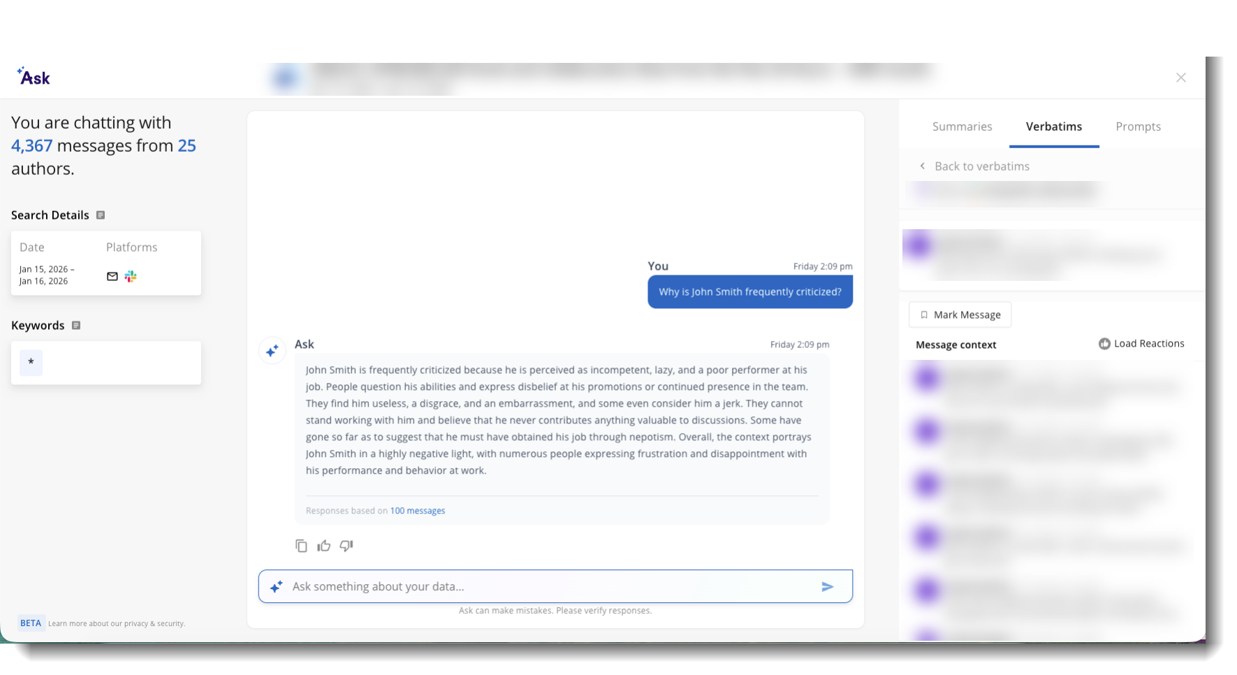 The Ask experience is currently generally available (GA) for message data types (such as Microsoft Teams, Slack, etc.). Support for email data is still in beta, so you may experience variable performance with email-related queries until we reach full GA for email. Thank you for your understanding as we continue to enhance Ask!