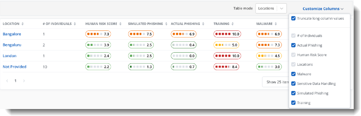 - Look at Department and Location scorecards to understand phishing simulation results, real-world phishing responses, and secure browsing behaviors.