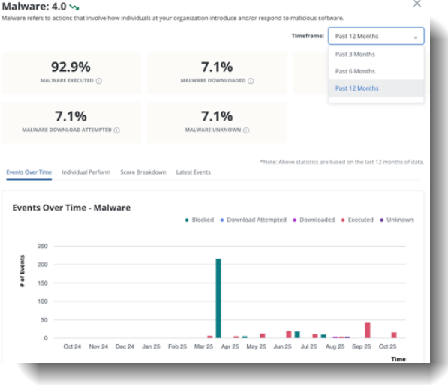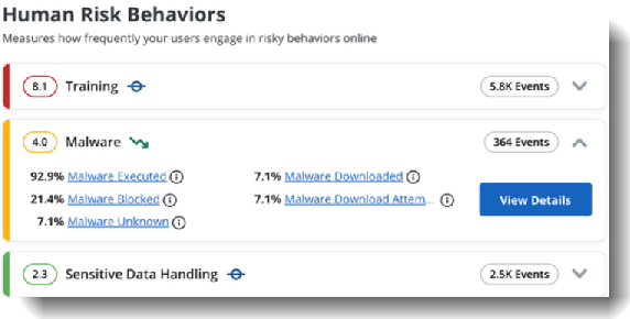 - Human Risk Behaviors: Review the behaviors present throughout your organization and identify new dimensions to address through training and reinforcement. Integrate these metrics with attack statistics and case resolution times to develop the most cost-effective security strategy for your organization.