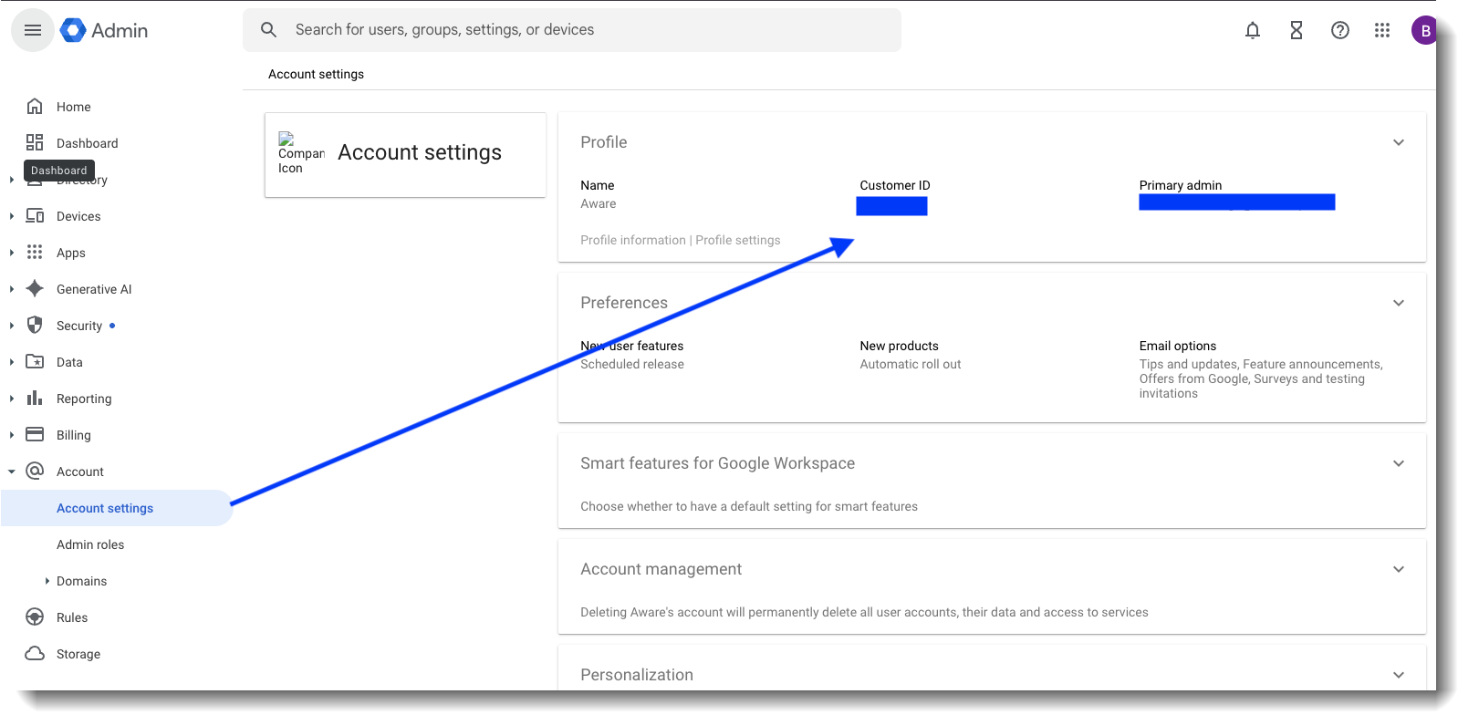 Both the Primary Administrator Email Address and Customer ID can be found in the GWS Administration Console | Account | Account Settings.